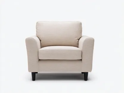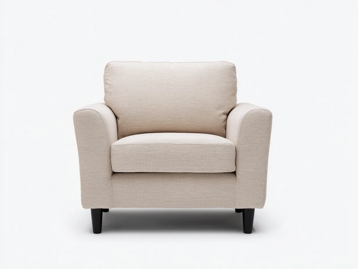 Le fauteuil est revêtu d'un tissu beige clair à la texture douce et régulière. La structure interne repose sur un cadre en bois, assurant une bonne stabilité pour un usage quotidien.