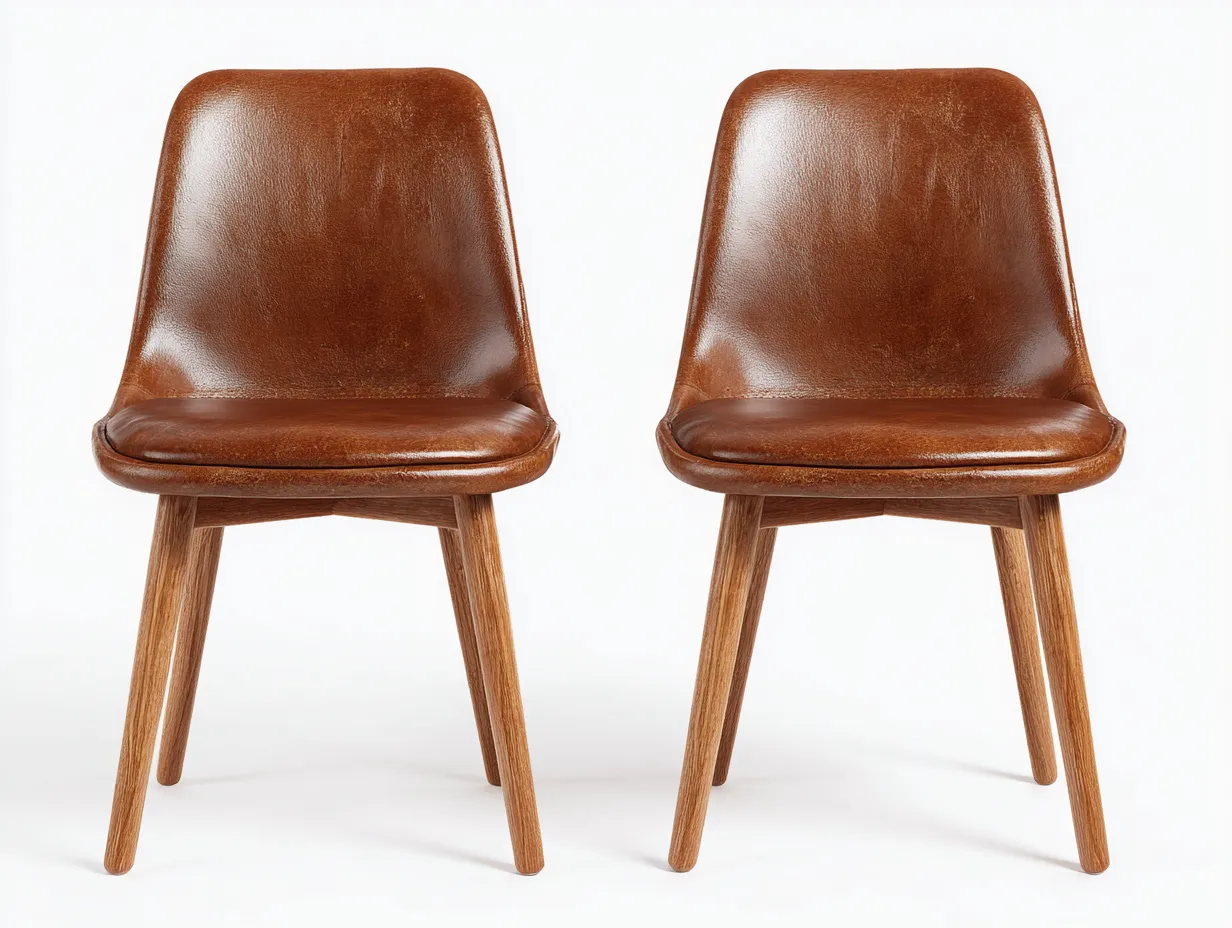 L'assise et le dossier sont revêtus de cuir marron, offrant un toucher agréable et un entretien facilité. La structure ainsi que les pieds sont fabriqués en bois massif soigneusement travaillé, garantissant stabilité et durabilité pour un usage quotidien en intérieur.