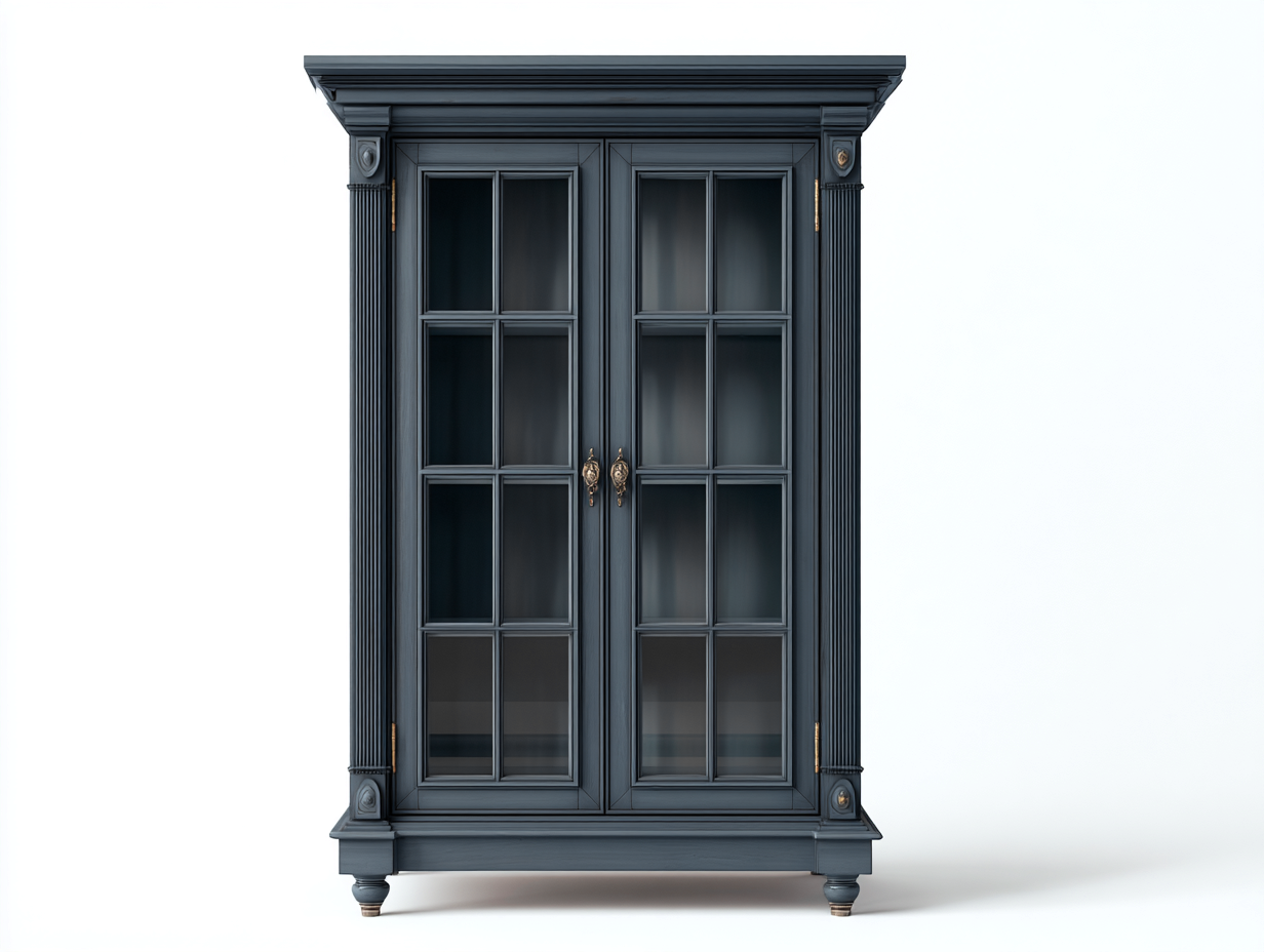 Le meuble est réalisé en bois avec une finition bleu foncé soignée. Les portes vitrées intègrent des panneaux en verre transparent qui assurent une visibilité claire du contenu tout en conservant un aspect sobre et intemporel.